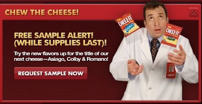Head over to the Cheez-It facebook page and click on the "Choose Cheese" tab. Vote for the cheese you'd like to support and you should see a pop-up offer (like the one shown above) for a FREE Sample of Cheez-It brand snack crackers! Allow 4 weeks for delivery.